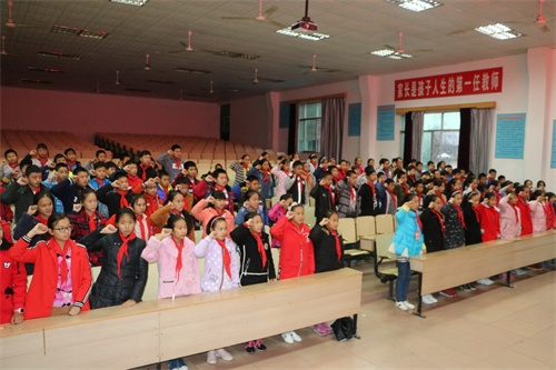10月13日下午,董市中学七年级全体同学佩戴鲜艳的红领巾,步入阶梯教室。大家齐唱激昂的中国少年先锋队,拉开了活动的序幕。之后,大队辅导员李万英老师带领大家观看了宣传片《厉害了,我的国》,以了解中国的伟大复兴梦、蓬勃发展路。她希望每位少先队员牢记自己是祖国建设的接班人,因此要好好学习,争当先锋。接着,张鑫鑫、易彬雪同学深情朗诵了诗歌《红领巾之歌》,表达了对烈士鲜血染红的红领巾的珍爱和星火相传、振兴中华的决心。三位推选出来的大队委员发表了就职演说,他们郑重承诺要以纯洁的心和实际行动完成少先队大队部布置的任务,热情为大家服好务。最后,全体少先队员高声重温了入队誓词:准备着,为共产主义事业贡献力量!